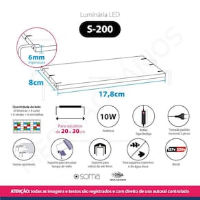 Especificações técnicas: Marca: Soma Modelo: Luminária Soma S-200 Potência: 10W Voltagem: 110v / 220v bivolt Composição: plástico, metais e circuitos eletrônicos Cor da luz: WRGB branca, vermelha, verde e azul Quantidade de leds: 30 brancas + 6 azuis + 6 verdes + 6 vermelhas Suporte para vidro até 9mm Tamanho: 17,8 x 8 cm Espessura: 6mm Tamanho do fio: 140 cm Serve para aquário de 20 a 30cm Peso aproximado: 247g