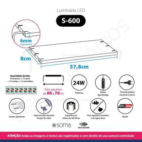 Especificações técnicas: Marca: Soma Modelo: Luminária Soma S-600 Potência: 24W Voltagem: 110v / 220v bivolt Composição: plástico, metais e circuitos eletrônicos Cor da luz: WRGB branca, vermelha, verde e azul Quantidade de leds: 70 brancas + 14 azuis + 14 verdes + 14 vermelhas Suporte para vidro até 9mm Tamanho: 57,8 x 8 cm Espessura: 6mm Tamanho do fio: 140 cm Serve para aquário de 60 a 70cm Peso aproximado: 560g