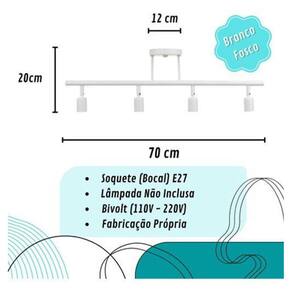 Luminária plafon 4 e27 trilho branco fosco --------------------------------------------------------------------------------------------------------------- Descrição do produto: Modelo: plafon trilho articulável 4 e27 Material: alumínio Cor do acabamento: branco fosco Tensão de rede: bivolt 127v / 220v Ambiente: interno/externo Garantia: 6 meses contra defeitos de fabricação Dicas importantes Produto com estoque disponível. Confira o produto desejado antes de finalizar a compra. Tire todas as suas dúvidas com o vendedor. Mantenhas seus dados atualizados, após a compra as informações não poderão ser mudadas. Antes de abrir uma reclamação consulte o vendedor, temos o prazer em entender para atender. Aguardamos sua avaliação positiva : Garantia Contra defeitos de fabricação. Envio Loja de fábrica
