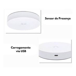 Especificações: - Material: Plástico - Medida: 8,5cm de diâmetro - Recarregável USB - Cor do Led: Branco Quente e Branco Frio - Potência: 5w - Luz de Emergência com Sensor de Movimento - Peso: 50 gramas