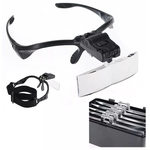 Itens inclusos na Lupa para Cabeça: 1 Lupa de cabeça profissional 1 Estojo para lentes 5 Lentes de aumento: 1.0X, 1.5X, 2.0X, 2.5X, 3.5X; 1 Cinta elásticas ajustável para cabeça 1 tecido flanela para limpeza das lentes