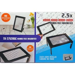 Lupa de Mesa com 6 Leds Mão Livre Amplia 2.5 X 23,5x15,5cm Lupa de Mesa com 6 Leds Mão Livre Ampliação 2.5X 23,5x15,5cm DESCRIÇÃO DO PRODUTO: Ideal para pessoas com qualquer grau de deficiência visual, idosos E não deficientes para utilizarem no seu dia a dia. Lupa ideal para ler livros, jornais, revistas, bulas, manuais, pequenos Trabalhos manuais entre outros. Possui 6 LED´s para iluminação auxiliar ou uso noturno. O Produto também acompanha suporte para sustentação em telas de Monitores servindo também como apoio de pescoço para leitura Pés para manter a lupa em cima do ponto de leitura ou trabalho mantendo As mãos livres entre outras aplicações. Funciona com 2 pilhas AAA Não incluso ou cabo USB Incluso Possui flexibilidade e prodtuzido em PVC Na cor Marrom Atenção Usuários: Produto não pode ser direcionado ao sol ou qualquer fonte de luz forte.