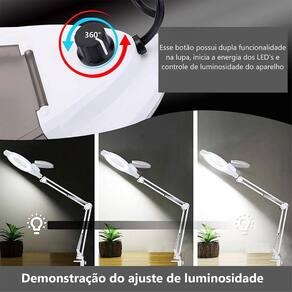 A lupa possui um suporte garra para fixar na mesa. Flexivel para mover em varios angulos, permitindo uma inspeçao detalhada.