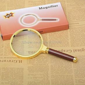 Lupa luxo de 70mm aumenta até 3.5 vezes Especificação do produto Cor: golden Diâmetro: 80mm Tamanho: 15,3 x 95 x 14mm. Lupa de mão de 80mm Material: mogno antigo + vidro Adequado para visualizar impressões pequenas ou objetos. Potência de ampliação: 3.5 x Material: estrutura de liga de zinco, alça superfície de madeira , Lente de vidro. É ideal para ampliar jóias, pintura, escultura, artesanato, selos, Costura, reparação de acessórios pequenos etc.