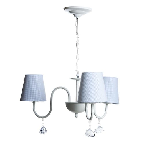 Quebre a monotonia com este lustre torneado com cúpula em tecido e detalhes encantadores, que será um elemento decorativo determinante para o espaço em que estiver exposto. Proporciona uma iluminação uniforme e agradável para o quarto do bebê. Dados TécnicosLustre com 3 lâmpadas em alumínio com pintura eletrostática branca, decoração com pingentes de acrílico e cúpulas em acetato forrado com tecido. Lâmpadas SuportadasEconômicas/ Led: Qualquer LâmpadaIncandescente amarela : Até 40w por Soquete MedidasLargura: 42 x 42 cmAltura: 20 cmCorrente: 25 cm
