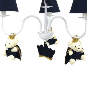 Quebre a monotonia com este lustre torneado com cúpula em tecido e detalhes encantadores, que será um elemento decorativo determinante para o espaço em que estiver exposto. Proporciona uma iluminação uniforme e agradável para o quarto do bebê. Dados TécnicosLustre com 3 lâmpadas em alumínio com pintura eletrostática branca e cúpulas em acetato forrado com tecido.Contém 3 ursinhos de pelúcia vestidos de príncipe pendurados nos braços do lustre e uma corôa de feltro no meio. A roupa do ursinho combina com o tecido da cúpula e os detalhes são dourados. Lâmpadas SuportadasEconômicas/ Led: Qualquer LâmpadaIncandescente amarela : Até 40w por Soquete MedidasLargura: 42 x 42 cmAltura com os ursos: 30 cm Corrente: 25 cm