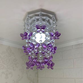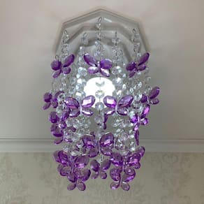 As borboletas de acrílico na cor lilás são o destaque desse lustre, trazendo um toque de charme e delicadeza ao ambiente. Além disso, as castanhas de acrílico transparente adicionam um brilho sutil, realçando a iluminação do quarto.