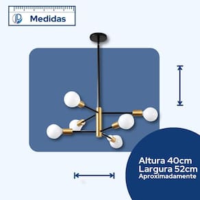 Acabamento: Preto com Dourado 6 Hastel para lâmpada de soquete E27 Soquetes E27 de até 40W por bocal Altura do suporte: 2cm Diâmetro do suporte: 12cm Comprimento total: 104cm Largura total: 42cm Cabo ajustável de 3m fácil ajuste Material: Estrutura em alumínio com acabamento preto e dourado