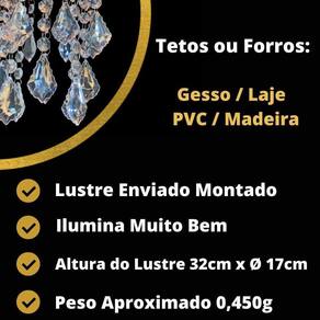5. Quais são as medidas do lustre? O lustre possui 17 cm de largura, 17 cm de comprimento e 32 cm de altura.