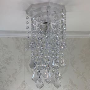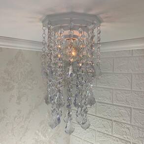Com uma base plafon de 17 cm em acrílico na cor branca e castanhas de acrílico transparente, o lustre possui uma altura de 32 cm, proporcionando uma iluminação intensa e uniforme. Ele é bivolt, podendo ser utilizado tanto em redes elétricas de 127v quanto de 220v.
