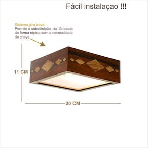 DIMENSÕES: Comprimento: 30cm Largura: 30 cm Altura: 11 cm Peso: 2,5 kg Qtde de lâmpadas: 2 led 6 a 15 W Alimentação: Bivolt 110/220