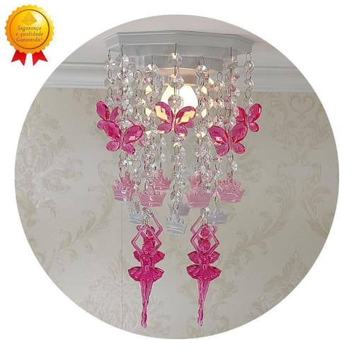 R: Os pingentes desse lustre são bailarinas, borboletas e coroas, feitos em acrílico nas cores rosa e branca.