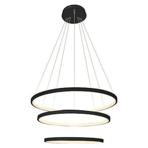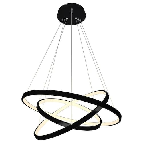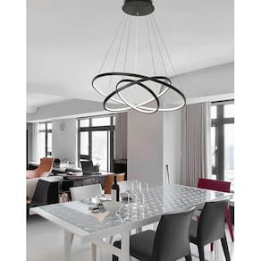 - led integrado - 3 led 36w, 30w e 23w - total 89w - luz branco quente 3200k - modelo: pendente led 3 anéis - material: estrutura em alumínio - difusor em sílica gel - cabo ajustável até 1. 5m fácil ajuste nos 3 aros para fazer o seu design . - diâmetro dos anéis: 1 anel 60cm/ 2 anel 40cm / 3 anel 30cm - acabamento: arco preto, luz branco quente. - voltagem: bivolt