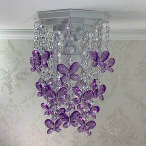 As castanhas de acrílico transparente dão um charme extra ao lustre, refletindo a luz de forma sutil e criando um efeito brilhante no ambiente. Além disso, as borboletas de acrílico na cor lilás trazem um toque de delicadeza e encanto, deixando o lustre ainda mais especial.