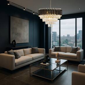 É refinado e impactante. O cristal utilizado neste pendente é uma fonte de brilho e transparência que encanta e fascina. Quando a luz incide sobre ele, cria reflexos e padrões que preenchem com uma aura de beleza e magia. Ao todo são 81 cristais divididos em 4 andares na estrutura do lustre. Além disso, o metal preto com dourado, adiciona requinte e solidez à peça.