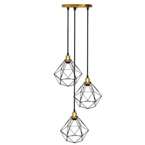 Lustre Pendente Aramado Triplo Diamante Cabo Regulável Luminária Agp Ilumini Retro - Cor: Dourado/Preto