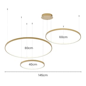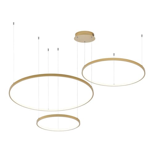 Especificações Gerais do Produto: Voltagem: Bivolt Dimensões AxLxP (mm): De cima para baixo: Círculo 1: 600mm; Círculo 2: 800mm; Círculo 3: 400mm (Largura total do lustre 1450mm) Cor: Dourado Material: Alumínio e Silicone Garantia: 1 ano junto ao fabricante Referência: PL-9733 Cor Principal: Dourado Fluxo Luminoso: 9200 lúmens Comprimento dos Cabos: Cabo ajustável, máximo 500 cm Potência: 115W Local de Uso: Interno Modelo/Tecnologia: LED Embutido Temperatura da Cor: 4000K – Neutra