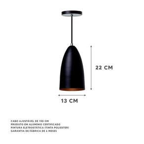 Especificações Técnicas: Marca: Ideallume Modelo: Bala Produto: Lustre Tamanho: M Cor: Preto Dimensões: 22 x 13 cm Canopla: redonda de 11cm de diâmetro Material: Alumínio Fio: Ajustável de 150cm Soquete: E-27 utilize a lâmpada que desejar Garantia: Garantia de 6 meses contra defeitos de fabricação