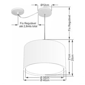 Pendente Com Desvio de Centro Indicado para decoração área interna, como mesas, sala de estar, sala de jantar, suite, quartos, corredor, hall, mezanino, escadas, churrasqueira, lareira, área de circulação, lojas, comércios, restaurante, varanda, balcão.DimensãoCúpula em Tecido: 40x25cm