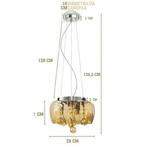 Altura da Peça Bacia : 12 cm Altura Total Máxima: 136,5 cm Material Predominante: Cristal K9, Vidro e Inox Soquete: G9 Lustre Pendente de Cristal Bacia 28cm Âmbar Luxo e Elegância