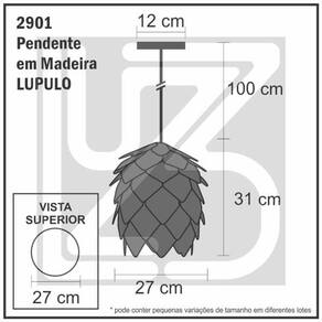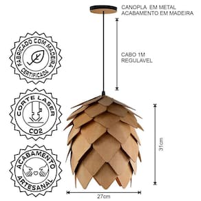 Descrição Técnica: - Modelo: LUPULO - Acabamento: Natural - Quantidade de soquetes: 1 - Material: 100% Madeira - Tamanho (LxAxP): 27 cm x 31 cm x 27 cm - Cabo: 1 m (regulável) - Soquete: Padrão E27 - Bivolt: Sim - Canopla: Em metal com acabamento madeira e regulador OBS. Como são fabricados 100% em madeira, podem apresentar diferenças em tonalidade conforme o lote da matéria prima. **Lâmpadas vendidas separadamente**