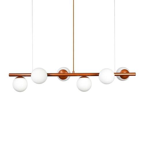 Lustre Pendente Bronze - 6 Globo Esfera De Vidro Branco A linha de luminárias modelo tem um ar contemporâneo, um estilo moderno, minimalista e ao mesmo tempo uma sensação retrô. Os pendentes podem ser colocadas em quartos, salas de jantar ou estar e as arandelas indicamos para lounges, salas, dormitórios ou até mesmo em lavabos. Com Design simples trazem classe e estilo a qualquer ambiente. Todos luminárias da linha são produzidas em alumínio com esferas de vidro branco. Descrição Técnica: - Modelo: Lustre Pendente com 6 Globos de Vidro - Acabamento: Pintura a pó térmica - Tamanho dos Globos de Vidro: 120mm - Quantidade de Globos de Vidro e soquetes: 6 - Material: Globo em Vidro e Hastes em Alumínio - Tamanho Aproximado (LxAxP) com os Globos de Vidro: 100 cm X 20 cm X 20 cm - Cabo: Cabo Revestido em Tecido - 70cm - Soquete: Padrão G9 - Bivolt: Sim ****