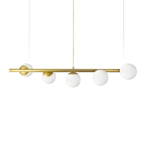 Lustre Pendente Ouro - 5 Globos Esfera De Vidro Branco A linha de luminárias modelo tem um ar contemporâneo, um estilo moderno, minimalista e ao mesmo tempo uma sensação retrô. Os pendentes podem ser colocadas em quartos, salas de jantar ou estar e as arandelas indicamos para lounges, salas, dormitórios ou até mesmo em lavabos. Com Design simples trazem classe e estilo a qualquer ambiente. Todos luminárias da linha são produzidas em alumínio com esferas de vidro branco. Descrição Técnica: - Modelo: Lustre Pendente com 5 Globos de Vidro - Acabamento: Pintura a pó térmica - Tamanho dos Globos de Vidro: 120mm - Quantidade de Globos de Vidro e soquetes: 5 - Material: Globo em Vidro e Hastes em Alumínio - Tamanho Aproximado (LxAxP) com os Globos de Vidro: 100 cm X 20 cm X 20 cm - Cabo: Cabo Revestido em Tecido - 70cm - Soquete: Padrão G9 - Bivolt: Sim ****