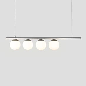 Lustre Pendente Prata - 4 Globos Esfera De Vidro Branco A linha de luminárias modelo tem um ar contemporâneo, um estilo moderno, minimalista e ao mesmo tempo uma sensação retrô. Os pendentes podem ser colocadas em quartos, salas de jantar ou estar e as arandelas indicamos para lounges, salas, dormitórios ou até mesmo em lavabos. Com Design simples trazem classe e estilo a qualquer ambiente. Todos luminárias da linha são produzidas em alumínio com esferas de vidro. Descrição Técnica: - Modelo: Lustre Pendente com 4 Globos de Vidro - Acabamento: Pintura a pó térmica - Tamanho dos Globos de Vidro: 140mm - Quantidade de Globos de Vidro e soquetes: 4 - Material: Globo em Vidro e Hastes em Alumínio - Tamanho Aproximado (LxAxP) com os Globos de Vidro: 100 cm X 17 cm X 27 cm - Cabo: Cabo Revestido em Tecido - 70cm - Soquete: Padrão G9 - Bivolt: Sim ****
