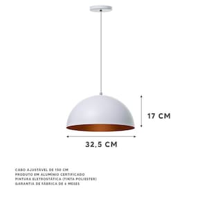Especificações Técnicas: Marca: Ideallume Modelo: Meia Lua Produto: Lustre Cor: Branco Dimensões: 17 x 32,5 cm Canopla: redonda de 11cm de diâmetro Material: Alumínio Fio: Ajustável de 150cm Soquete: E-27 utilize a lâmpada que desejar Garantia: Garantia de 6 meses contra defeitos de fabricação Quantidade: 2 Unidades