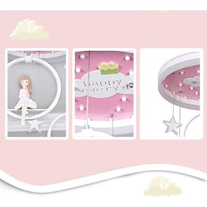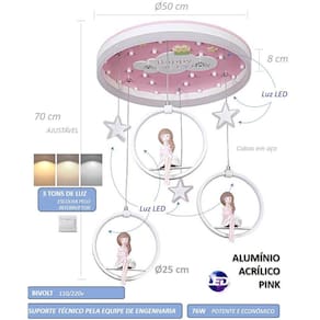 Se apaixone pelos detalhes: • Vistoso: 50cm de comprimento por 70cm de altura, com pendentes das princesas, em LED; • Luxuoso: Design fino, com acabamento premium; • Versátil: Ajuste no seu próprio interruptor a cor da luz que mais combina com o ambiente, dentre branco quente, neutro e frio; • Econômico: Luzes em LED, na base, nos spots, no balanço e nas estrelas;