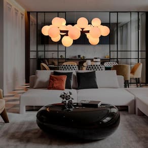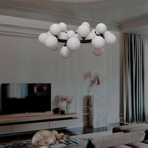 Descrição Material: estrutura em metal e cúpula redonda de vidro Cor: estrutura preto fosco e cúpulas branca leitosa Quantidade de lâmpadas: 25 lâmpadas não inclusas Bocal: g9 em led Medidas: 26 x 70 cm altura x diâmetro