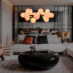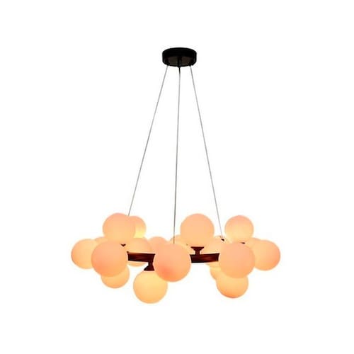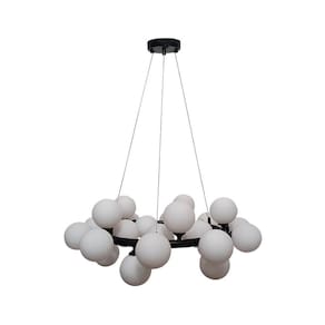 Descrição Material: estrutura em metal e cúpula redonda de vidro Cor: estrutura preto fosco e cúpulas branca leitosa Quantidade de lâmpadas: 25 lâmpadas não inclusas Bocal: g9 em led Medidas: 26 x 70 cm altura x diâmetro Ean: 7898612683451