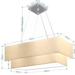Você já deve ter reparado que os pendente retangular duplo são luminária suspensa que oferecem um charme único aos espaços e estão cada vez mais presentes na decoração. Utilizamos em nossa casa em uma mesa de jantar e só escolha a cor da cúpula em tecido que mais combine com seu ambientes.
