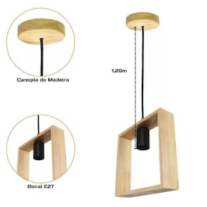 Pendente rústico em madeira, traz estilo e beleza para seu ambiente. Ideal para restaurantes, bares, salas de jantares, sítios, casas de campo, comércios, cozinhas, varandas, escritórios, resorts, áreas de estar, armazéns ou onde preferir, deixando o local mais elegante.Especificações do Pendente:- Materiais do Pendente: Madeira, Metal e fio - Modelo: Pendente Quadro - Cabo ajustável - Bocal de metal com rosca E27 - Voltagem: Bivolt- Potência máxima por pendente: Até 50W- Base para fixação no teto: Metal- Tampa/Canopla: Redonda de madeira - Fiação: Fio PP com Acabamento em tecido - Acompanha peças para montagem e instalação do produto- Indicado para uso: Interno- *ATENÇÃO: O pendente não acompanha nenhuma lâmpada. Dependendo do lote é possível que tenham pequenas diferenças de tonalidades de cores no pendente ou no fioMedidas do pendente: - Medida total do pendente sem o quadro de madeira: De ponta a ponta 1,20cm- Medida do fio: 1,15m - Tampa/Canopla: 10cm de diâmetro x 2cm de altura- Medidas do quadro de madeira: 20cm de altura x 20cm de largura x 5cm de profundidade - Medidas detalhadas nas fotos do anúncioItens inclusos no kit: - 1 Pendente/Bocal com fio - 1 Tampa/Canopla- 1 Kit instalação contendo parafusos, buchas e base para fixaçãoGarantia do vendedor: 90 dias