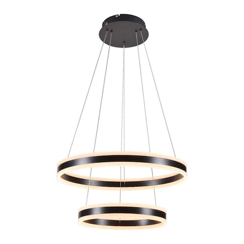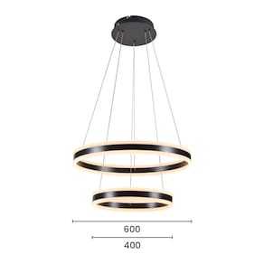 Especificações Gerais do Produto: Voltagem: Bivolt Dimensões AxLxP (mm): De cima para baixo: Círculo 1: 600mm; Círculo 2: 400mm Cor: Preto Material: Alumínio e Acrílico Garantia: 1 ano junto ao fabricante Referência: DCD03018 Cor Principal: Preto Fluxo Luminoso: 12600 lúmens Comprimento dos Cabos: Cabo ajustável, máximo 250 cm Potência: 126W Local de Uso: Interno Modelo/Tecnologia: LED Embutido Temperatura da Cor: 3000K - Branco Quente