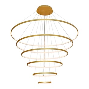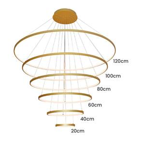 Especificações Gerais do Produto:Voltagem: BivoltDimensões AxLxP (mm): De cima para baixo: Círculo 1: 1200mm; Círculo 2: 1000mm; Círculo 3: 800mm; Círculo 4: 600mm; Círculo 5: 400mm; Círculo 5: 200mmCor: DouradoMaterial: Alumínio e SiliconeGarantia: 1 ano junto ao fabricanteReferência: QD05447Cor Principal: DouradoFluxo Luminoso: 18480 lúmensComprimento dos Cabos: Cabo ajustável, máximo 500 cmPotência: 264WLocal de Uso: InternoModelo/Tecnologia: LED EmbutidoTemperatura da Cor: 3000K - Branco Quente