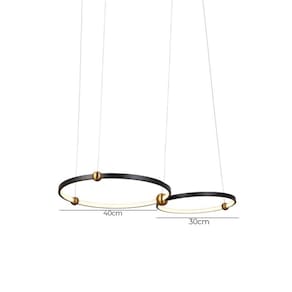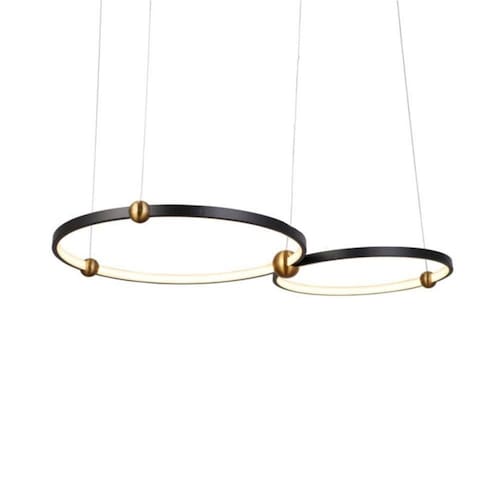 Voltagem: Bivolt;Dimensões AxLxP (mm): Círculo 1: 400mm; Círculo 2: 500mm;Material: Metal e Alumínio;Garantia: 1 ano junto ao fabricante;Referência: SKY-3075PT (Preto e Dourado);Comprimento dos Cabos: Cabo ajustável, máximo 300 cm;Potência: 58W;Local de Uso: Interno;Modelo/Tecnologia: LED Embutido;Temperatura da Cor: 3000K - Branco Quente;