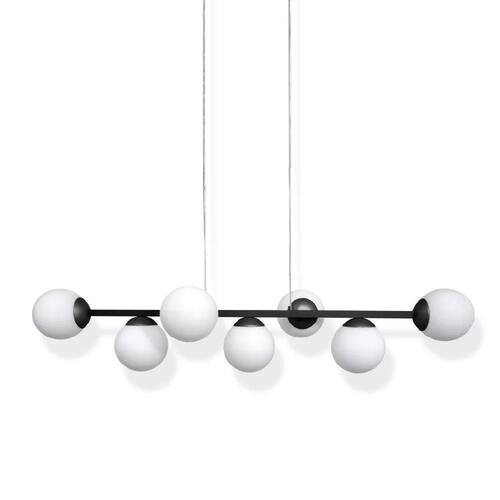 Lustre pendente trilho bubble c/7 globos Especificações Técnicas: - Sua estrutura retangular comporta tensão Bivolt. - Utiliza 7 Halopin - Coloração Preto polido. - Estrutura fabricado em alumínio reforçado. - Globos fabricados em vidro. - Fios de sustentação cristal invisível. - Altura regulável. - Altura máxima 150 cm. - Tamanho do globo 15 cm. - Tamanho da base de sustentação 30 cm atenção, esse tamanho se refere a fixação no teto - Modelo Jabuticaba com design inovador.