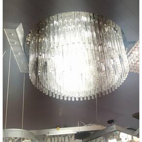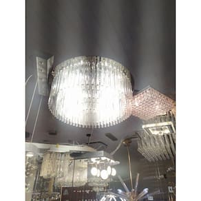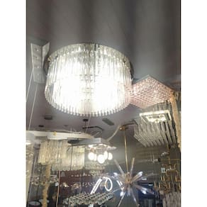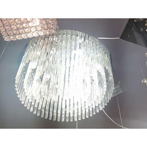 Lustre redondo com base em metal cromado e cristais transparentes. Capacidade para 12 lampadas G9 (não acompanham). Diâmetro 60 cm, altura 25,50 cm.
