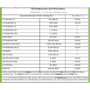 Este suplemento combina antioxidantes que auxiliam na proteção celular contra os efeitos dos radicais livres. A fórmula contém ingredientes que contribuem para o equilíbrio nutricional, especialmente em rotinas com exposição frequente à luz artificial e solar. Pode ser uma alternativa para complementar uma alimentação equilibrada e um estilo de vida saudável. - Sugestão de consumo 02 cápsulas ao dia. Ingerir com 200ml de água. - Composição: Vitamina d3 , vitamina e , vitamina c , vitamina b1, vitamina b2, niacina , vitamina b6, vitamina b9 , vitamina b12 , sulfato de cobre, selenito de sódio, ésteres de astaxantina de haematococcus, zeaxantina, luteína da flor de tagetes erecta, bisglicinato de zinco.