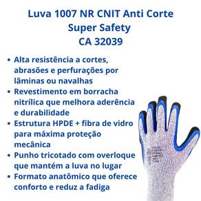 Luva 1007 NR CNIT Anti Corte Super Safety CA 32039 Proteção e destreza para trabalhos de alto risco A Luva 1007 NR CNIT da Super Safety é fabricada em fios de HPDE (polietileno de alta densidade) com fibra de vidro e acabamento em borracha nitrílica na palma e dedos. Seu punho tricotado de 7 cm com overloque garante ajuste seguro e evita a entrada de partículas.