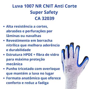 Luva 1007 NR CNIT Anti Corte Super Safety CA 32039 Proteção e destreza para trabalhos de alto risco A Luva 1007 NR CNIT da Super Safety é fabricada em fios de HPDE (polietileno de alta densidade) com fibra de vidro e acabamento em borracha nitrílica na palma e dedos. Seu punho tricotado de 7 cm com overloque garante ajuste seguro e evita a entrada de partículas.