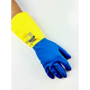 Luva de segurança confeccionada em látex natural e revestimento na face palmar, ponta dos dedos e dorso em neoprene, acabamento antiderrapante na face palmar e ponta dos dedos, revestimento interno em flocos de algodão.
