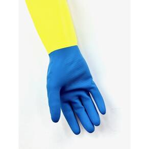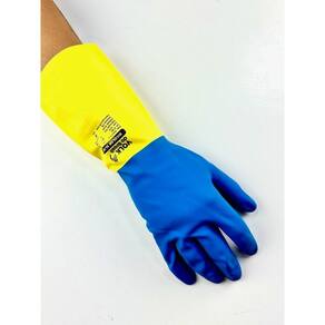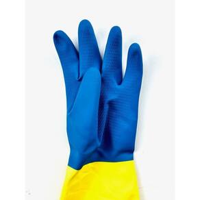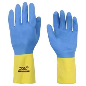 Luva de segurança confeccionada em látex natural e revestimento na face palmar, ponta dos dedos e dorso em neoprene, acabamento antiderrapante na face palmar e ponta dos dedos, revestimento interno em flocos de algodão.