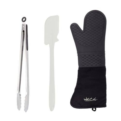 Kit Profissional de Cozinha com luva de silicone, espátula de silicone e pegador inox em cano longo. A Luva Profissional de Silione WECK é fabricada em silicone com revestimento de algodão internamente. Oferece ótima resistência para atividades com temperaturas altas. É ideal para proteção das mãos e antebraço, graças ao seu punho alongado de 50 cm. É de fácil higienização e alta durabilidade. Essa luva oferece a você a tranquilidade necessária de cozinhar ou manusear qualquer tipo de utensílio quente sem preocupações, e protegendo ainda mais contra acidentes. Largamente utilizada no manuseio de produtos com altas temperaturas, indústrias alimentícias, panificadoras, restaurantes e refeitórios industriais, lavanderias e autoclaves, e trabalhos com vapor d´àgua. Suporta até 240ºC.
