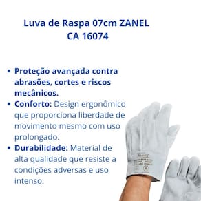 Especificações técnicas - Material: Raspa de couro bovino curtido ao cromo. - Punho: 07 cm. - Marca: Zanel. - Certificação: CA 16074.