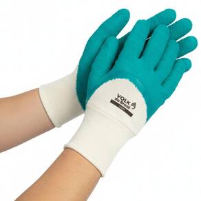 Luva de segurança confeccionada em fibras naturais tipo interlock, revestimento da face palmar, ponta dos dedos e dorso dos dedos em látex corrugado, punho de malha costurado.