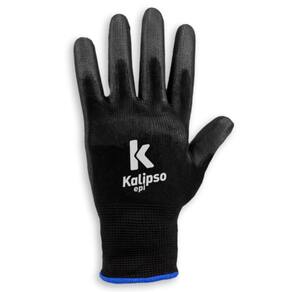 Luva de proteção, tricotada em náilon, palma, face palmar dos dedos e pontas dos dedos com revestimento em poliuretano; punho com elastano.
