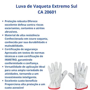 Luva de Vaqueta Extremo Sul CA 20601 Proteção Mecânica Essencial e Versátil A Luva de Vaqueta Total, fabricada pela Extremo Sul, é confeccionada em couro vaqueta, um material com excelente resistência que oferece grande proteção contra riscos escoriantes, cortantes e atritos abrasivos. Este equipamento foi projetado para diminuir os acidentes durante a jornada de trabalho, sendo aprovado nos testes das normas técnicas de segurança do trabalho e contando com a devida certificação do INMETRO. É uma luva de segurança essencial e um dos melhores custo-benefícios, especialmente para quem atua na construção civil e em diversas outras aplicações. Benefícios