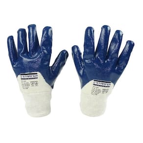 A Luva em Malha Tricotada Revestida de Nitrílico Parcial Azul Tamanho XG da Starfer é uma peça de segurança confeccionada em malha de algodão tricotada em uma única peça, destacando-se pelo revestimento nitrílico na face palmar e 3/4 da plantar, acompanhada por um punho elástico para ajuste otimizado. Possui o Certificado de Aprovação CA Nº 49.476, disponível no tamanho 10/XG, e apresenta uma combinação de cores, sendo a palma, ponta dos dedos e parte do dorso em azul, enquanto a porção restante do dorso e o punho são em tom bege.